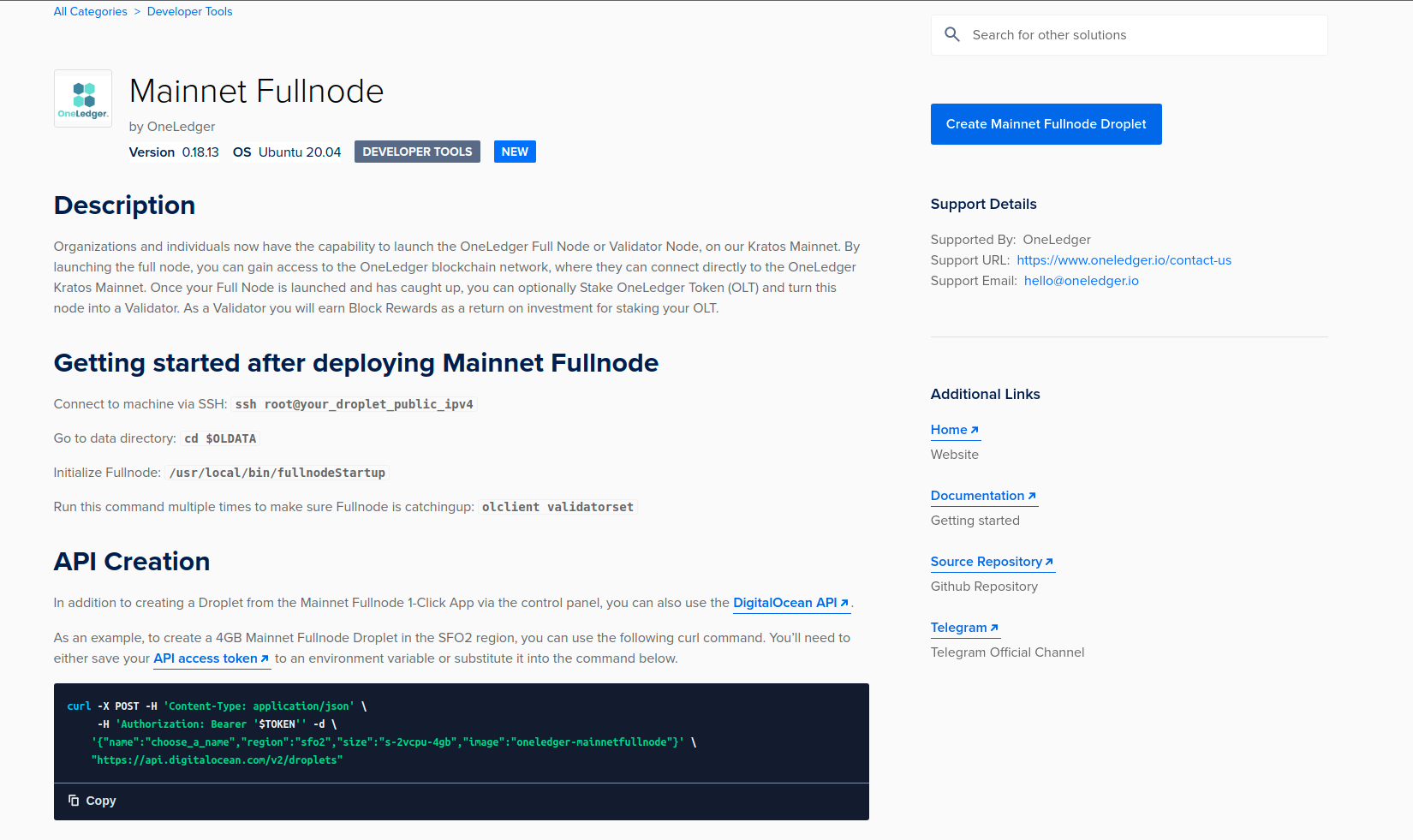 Click on Create Mainnet Fullnode Droplet and deploy OneLedger Mainnet Fullnode.