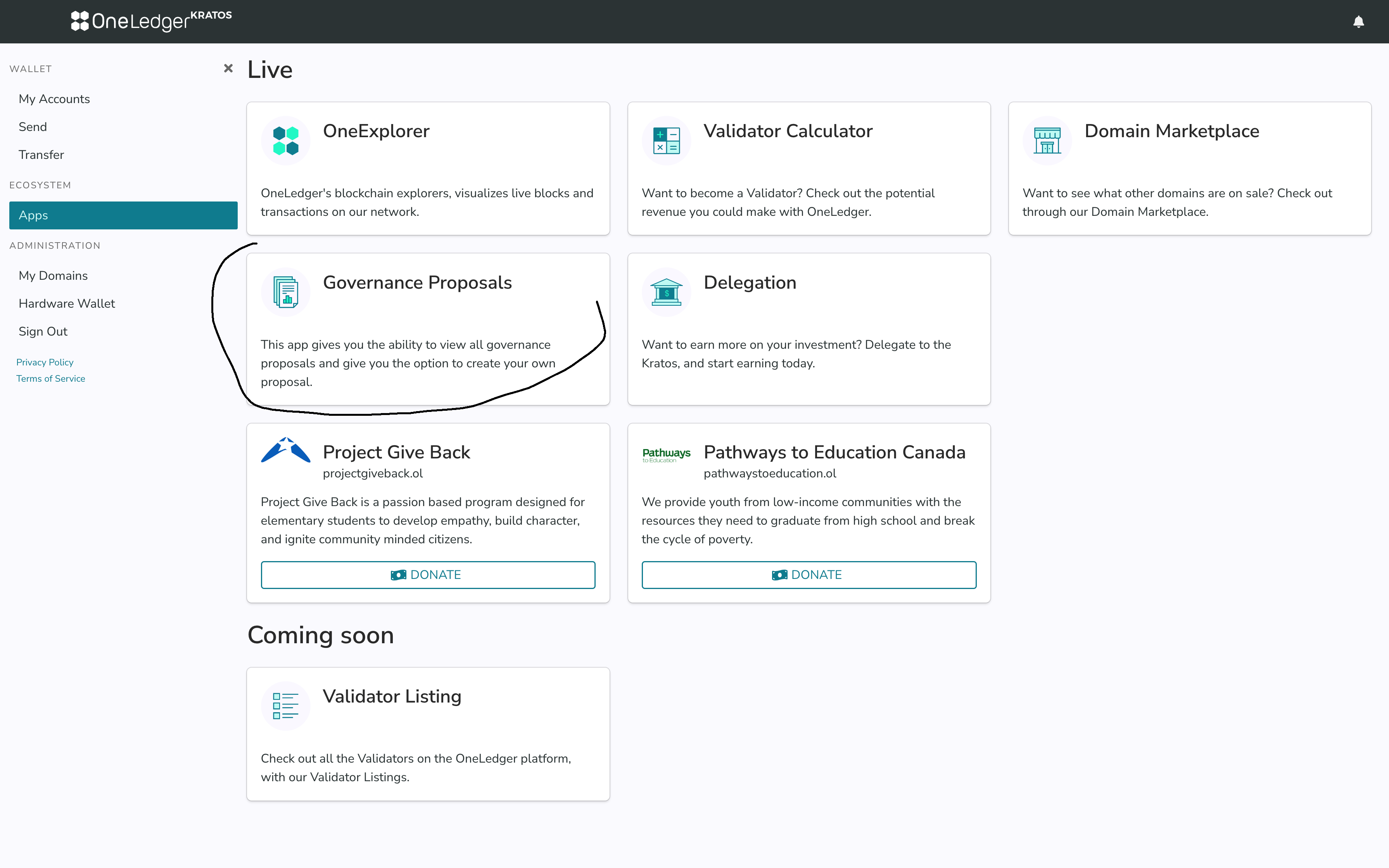 - Go to Ecosystem -> Apps section in OneWallet and click on Governance Proposals icon