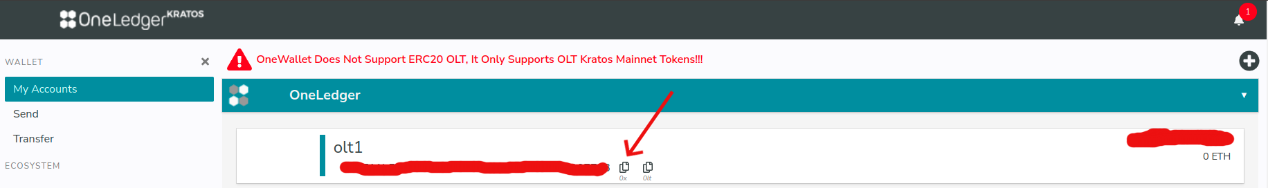 Copy "OLT" address from Metamask and change prefix "0x" --> "0lt"